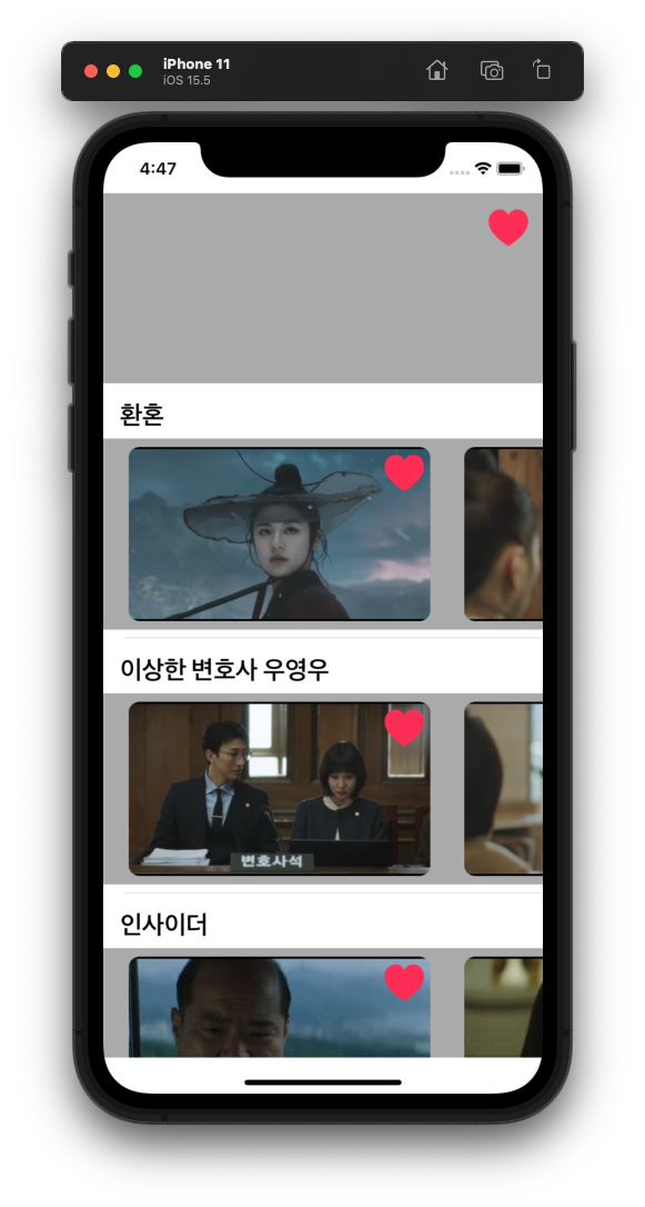 - 예시 이미지와 같이 테이블뷰 셀 안에 콜렉션뷰가 포함되어 있기때문에 포함관계에 유의하면서 뷰를 구성해야한다.