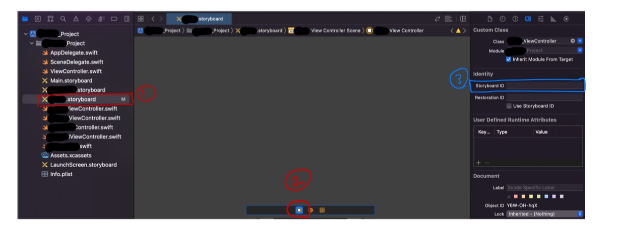6.변경할 스토리보드 파일을 선택하고 ViewController를 선택한 뒤 인스펙터 영역의 아이덴터티 영역에서(왼쪽에서 네번째 파란 아이콘) Storyboard ID에 원하는 ID를 부여하면 된다.